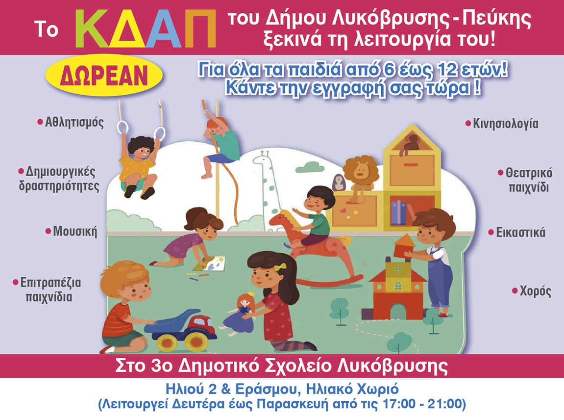 Ο Δήμος Λυκόβρυσης – Πεύκης ανακοινώνει την έναρξη υποβολής αιτήσεων για το Κέντρο Δημιουργικής Απασχόλησης Παιδιών (ΚΔΑΠ), μια νέα κοινωνική δομή που λειτουργεί για δεύτερη χρονιά. Το πρόγραμμα παρέχεται δωρεάν, χωρίς καμία οικονομική επιβάρυνση για τους γονείς, στο πλαίσιο της κοινωνικής πολιτικής του Δήμου.