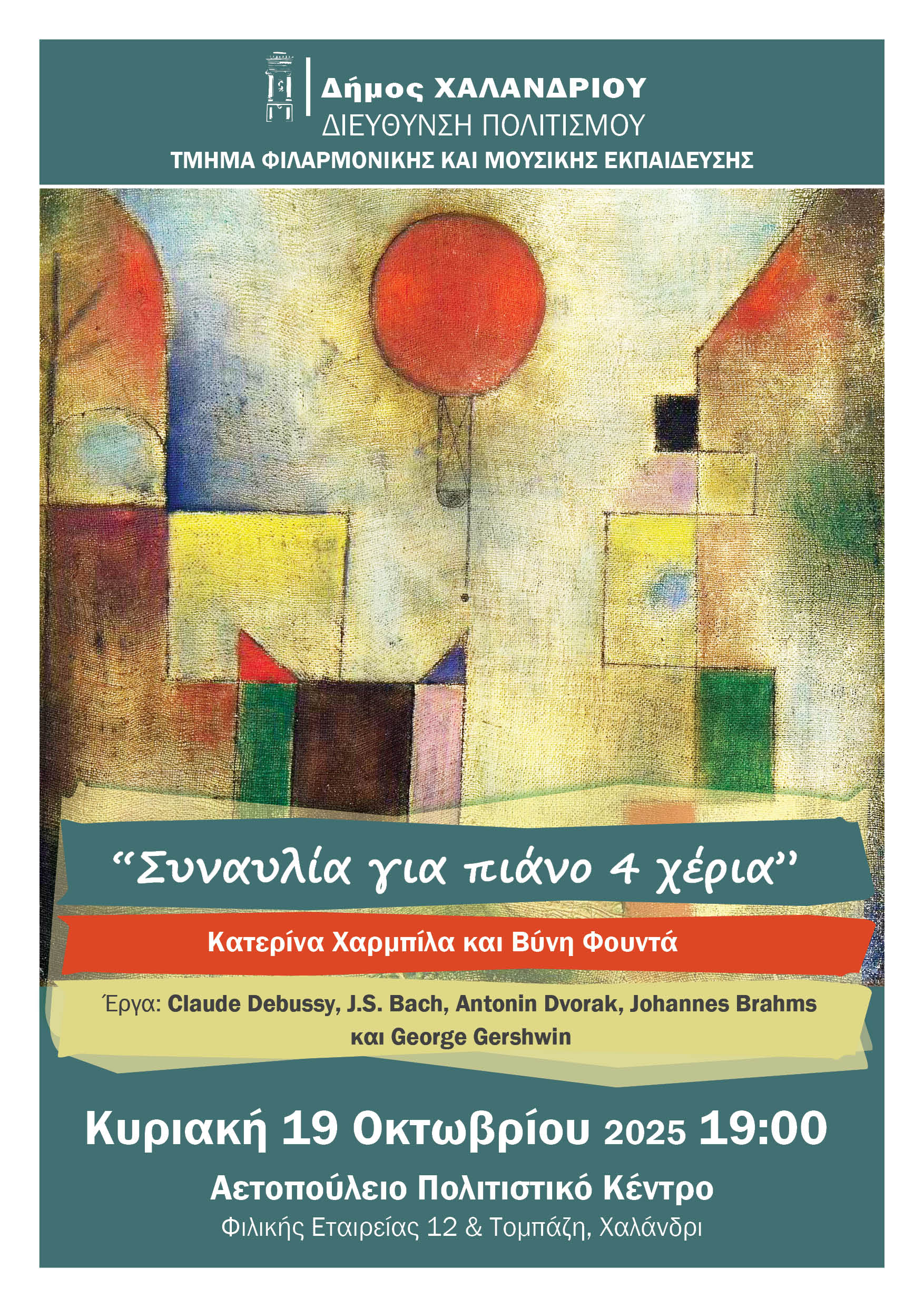 Ξεκινούν οι συναυλίες της σειράς “Μουσική Κυριακή στο Αετοπούλειο” που διοργανώνει το Εργαστήρι Μουσικής Εκπαίδευσης της Φιλαρμονικής Ορχήστρας του Δήμου Χαλανδρίου. Η πρώτη συναυλία έχει προγραμματιστεί για την Κυριακή 19 Οκτωβρίου 2025 και ώρα 7.00′ μ.μ., φυσικά στο Αετοπούλειο Πολιτιστικό Κέντρο του Δήμου.